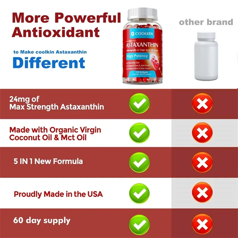 5-in-1 for better absorption: Highly absorbed, high potency 24 mg Astaxanthin softgels provide natural astaxanthin, a fat-soluble antioxidant carotenoid derived from the microalgae Haematococcus, combined with South African licorice root extract and grapeseed oil extract to increase nutrient absorption by up to 99%. This astaxanthin supplement helps fight free radicals and supports skin, joint, eye and immune system health. Ashwagandha also aids relaxation and promotes better rest.