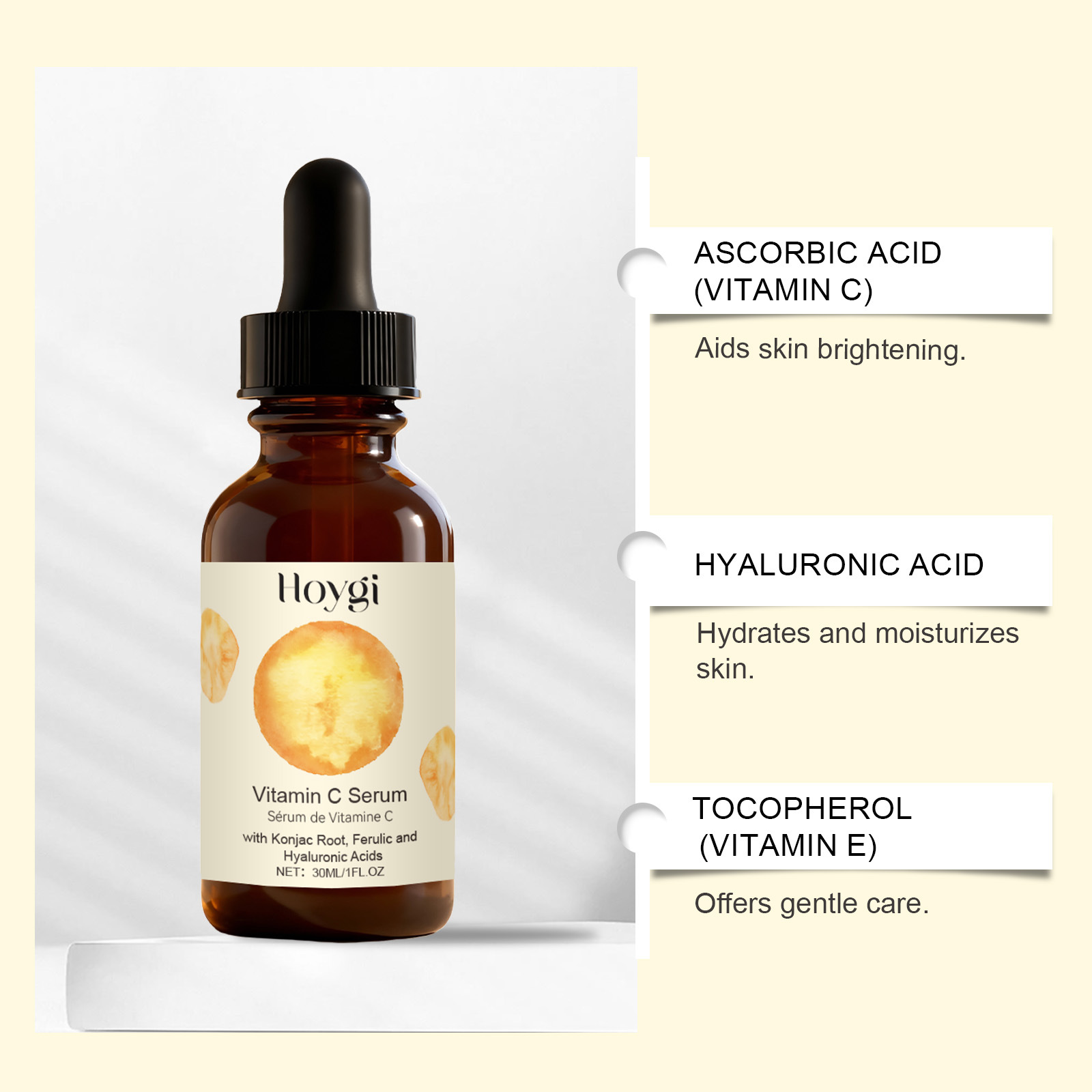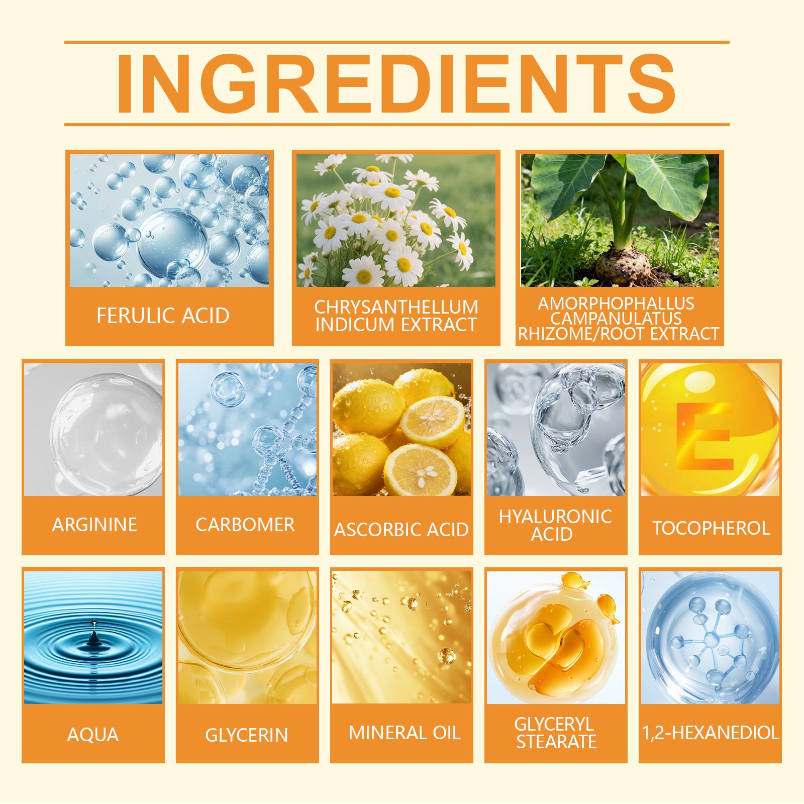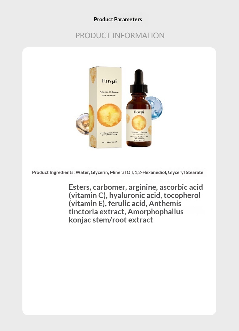 Ingredients: Water, Glycerin, Mineral Oil, 1,2-Hexanediol, Glyceryl Stearate, Carbomer, Arginine, Ascorbic Acid (Vitamin C), Hyaluronic Acid, Tocopherol (Vitamin E), Ferulic Acid, Anthemis Nobilis Flower Extract, and Konjac Stem/Root Extract.